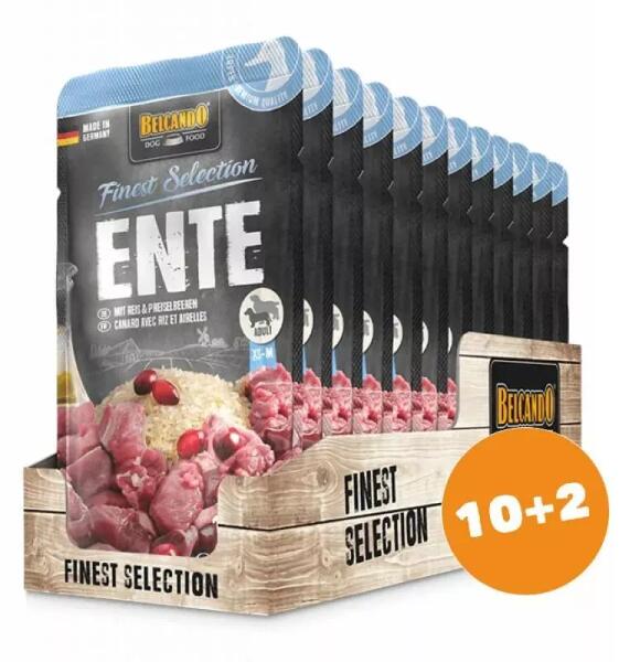 Kacsahús rizzsel és vörös áfonyával 125g BELCANDO® FINEST SELECTION kutyaeledelKiváló receptúrák egy etetési méretben csomagolva. Szaftos, finom hozzávalókkal ízesített, kíméletesen főzött hús, tasakba kiporciózva. A hidegen sajtolt bogáncsolaj létfontosságú telítetlen zsírsavakat ad hozzá. A BELCANDO® FINEST SELECTION rendkívüli ízletességének és hasznosíthatóságának köszönhetően kiváló az érzékeny és válogatós kutyáknak. Minőségi garancia:A BELCANDO FINEST SELECTION kutyaeledel gondosan és kíméletesen feldolgozott természetes termékekből, aroma, színező- és tartósítószerek használata nélkül készült. Etetési javaslat: keverje a BELCANDO FINEST SELECTION kutyaeledelt a BELCANDO szárazeledellel, így kutyája nap mint nap egy új íz világgal fogyaszthatja kedvenc eledelét. Szobahőmérsékleten, a táblázatnak megfelelő adagban etethető. Mindig álljon a kutya rendelkezésére friss ivóvíz!