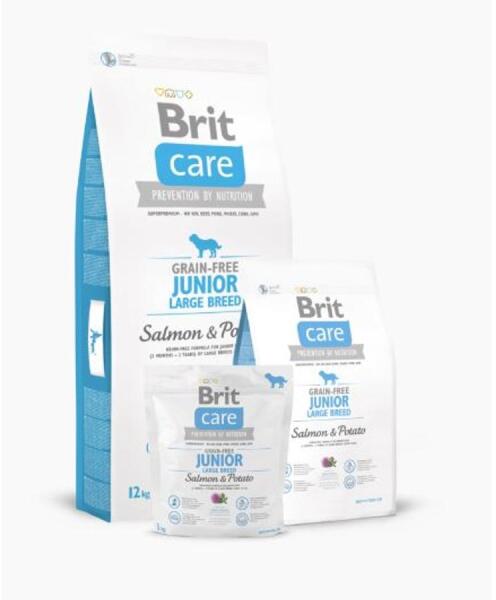 Brit Care Grain-free Junior Large Breed Salmon & Potato  egy teljes értékű prémium száraztáp fiatal kutyusoknak. Kifejezetten nagytestű fiatal kutyáknak kifejlesztett eledel. Ideális 25kg fölötti, kutyáknak 3 hónapostól 2 éves korig. - Gabonamentes és hipoallergén receptúra.