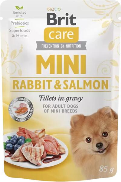 Brit Care Mini Rabbit & Salmon Fillets in Gravy 24x85g – Szuperprémium állateledel kistestű kutyáknak Leírás A Brit Care Mini Rabbit & Salmon fillets in gravy prémium minőségű nyúl- és lazacdarabokból készült, amelyek zamatos szószban találhatóak, hogy még a legválogatósabb kutyusokat is elkápráztassák. Ez az ideális szuperprémium nedves eledel a kis- és apró termetű felnőtt kutyák számára készült, hogy a száraz tápok tökéletes kiegészítője legyen. Főbb előnyök