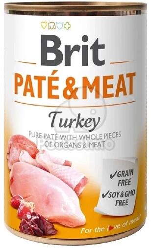 Teljes értékű nedves állateledel felnőtt kutyák számára. 70% pulyka és csirke. Pástétommal és húsdarabokkal. Gabonamentes, szójamentes.   Összetétel:  26% pulyka, 24% csirke, 8% egész csirkemáj, 12% szív és tüdő, 28,5% húsleves, 1% ásványi anyag, 0,5% lazacolaj.   Analitikai összetevők : nyersfehérje 11,0 %, zsírtartalom 9,0 %, nyershamu 6,5 %, nedvesség 75,0 %, nyersrost 0,4 %.   Tápértékkel rendelkező adalékanyagok 1 kg-onként:   D3-vitamin (E671) 250 IU, E-vitamin (3a700) 100 mg, cink (3b606) 15 mg, vas (E1) 10 mg, mangán (E5) 3 mg, jód (3b201) 0,75 mg, réz (E4) 0,5 mg, biotin (3a880) 0,2 mg.   Adagolási útmutató:   Brit Paté & Meat ideális kiegészítő a száraz eledelhez is. Segíti a tápanyagfelvételt és folyadékbevitelt. Az egynapi adag aktivitástól és környezettől függően változó. A változatosság növelése és az étvágy fokozása céljából történő etetés esetén, ne feledje csökkenteni kutyája ajánlott napi rendszeres adagját. Szobahőmérsékleten etesse. Biztosítson kutyájának hozzáférést friss ivóvízhez. Száraz hűvös helyen tárolja. A doboz kinyitása után tartsa a hűtőszekrényben. A lejárati idő és a tétel száma: lásd a doboz alján. Etetési táblázat : Kutya mérete Small