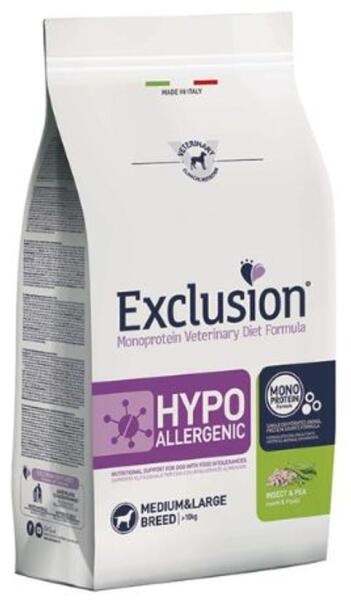 Az  Exclusion Hypoallergenic Insect & Pea  Medium & Large egy ízletes rovaros száraztáp táplálék-intoleranciáva l küzdő kutyák számáraKifejezetten közepes és nagytestű (10kg feletti) kutyáknak készült táp. Monoproteines formula, így eliminációs diétában is alkalmazható. Ízletes rovaros- borsós ízkombináció: