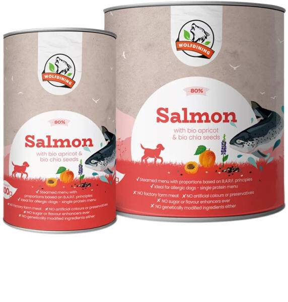 Teljes értékű, monoproteines menü lazachússal (73 %), bio sárgabarackkal, bio chiamaggal, bio lenmagolajjal és csukamájolajjal — adalék- és töltőanyagmentes, bárf-alapelveken alapuló kész étel.