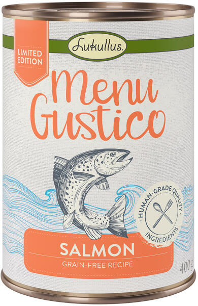 Lukullus 6x400g Lukullus Menu Gustico - Lazac, sárgarépa, lucerna & spenót nedves kutyatáp