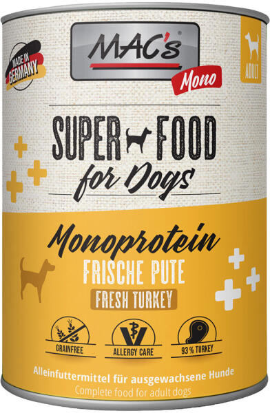 A zooplus. hu kínálatából: Jól tolerálható kutyatápot keres, mert kedvence hajlamos az élelmiszer-intoleranciára? Akkor a MAC Mono Sensitive gazdaságos csomagja tökéletes választás. Jól emészthető nedvestápról van szó, sok, ám változatonként csak egyetlen húsfajtából származó húsból készül. Single protein receptúrája miatt a MAC's Mono Sensitive jól alkalmazható kizárásos diétához is. A MAC's Mono Sensitive nem tartalmaz állat- és csontlisztet, emellett gabona- és szójamentes. A MAC's Mono Sensitive 24 x 800 g jellemzői nagy vonalakban:Ízletes nedveseledel felnőtt kutyáknakNagy gazdaságos csomag: több kutyával rendelkező háztartásokba ill. készletezésre is kiválóKülönösen jól tolerálható: táplálékérzékeny kutyák számára is ideálisVáltozatonként csak egyféle hús: csupán egy állati fehérjeforrás - így a nedvestáp alkalmas kizárásos diétára isMagas húsrészarány: a fajnak megfelelő és természethű táplálkozás érdekébenSzója- és gabonamentes receptúra: ilyen jellegű intoleranciával és allergiával küzdő kutyák számára is alkalmasÁllat-és csontliszt, mesterséges színezékek és aromák nélkülMinőségi termék NémetországbólTöbb finom ízváltozatban