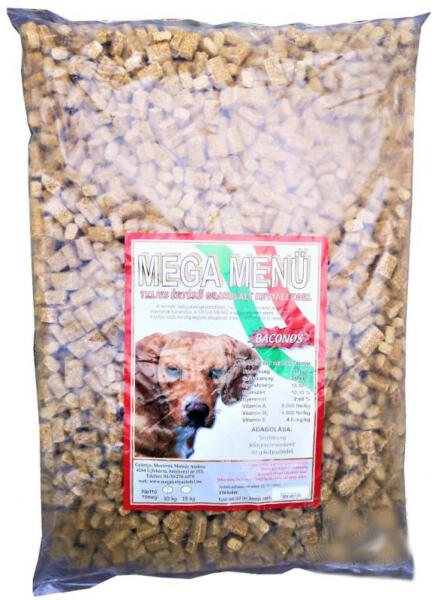 Teljes értékű baconos ízesítésű granulált kutyaeledel amely megfelelő arányban tartalmaz válogatott gabonaféléket állati fehérjéket ásványi anyagokat zsírokat és vitaminokat Etetéskor a kutya előtt mindig legyen elegendő friss víz 9 hetes kortól adhatóBeltartalmi értékNedvesség 1410 Szárazanyag 8590 Nyersfehérje 1890 Nyerszsír 1010 Nyersrost 268 Vitamin A 8000 Nekg Vitamin D3 1000 Nekg Vitamin E 40 mgkg