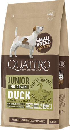 Kacsahúsos kutyaeledel kistestű növendék kutyáknak, fagyasztva szárított nyerhúsból készült bevonattal. A Quattro termékválaszték innovatív "fagyasztva szárított húsbevonat" technológiával készül. Ez az exkluzív megoldás lehetővé teszi, hogy a tápszemcséket fagyasztva szárított kacsahússal vonják be, biztosítva, hogy kutyád imádja az eledelét. Búza, szója, árpa és egyéb allergiás reakciókat okozó anyagok (glutén, GMO) nélkül készül.