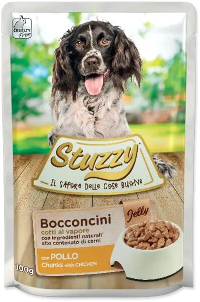 Tasakos eledel csirkehússal zselében. Teljes értékű eledel felnőtt kutyák számára. Etetési útmutató: lásd a csomagoláson található táblázatot. Összetevők: 45% hús és állati eredetű termékek (8% csirkehús), növényi eredetű melléktermékek (0,4% inulin), ásványi anyagok. Analitikai összetevők: nyersfehérje 7%, nedvesség 82%, nyersolajok és zsírok 4%, nyershamu 1,5%, nyersrost 0,3%, D3-vitamin 80 NE / kg, E-vitamin (alfatokoferol) 20 mg / kg, biotin 80 NE / kg, cink-szulfát-monohidrát 13,5 mg / kg,