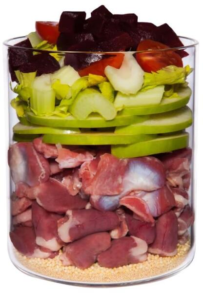 Kompozíció:  C sirkeszív (24%), paradicsom (17%), csirkegyomor (16%), csirkemáj (11%), körte, amarant (5%), csirkehús (4%), köles, cékla*, zellerszár, kókuszliszt, repceolaj, osztriga*, sörélesztő*, bazsalikom* (0,4%), ásványi agyag*, andoki só, csipkebogyó*, tengeri moszat*, ásványi anyagok*szárítva Analitikai összetevők:  Fehérje 9,1% zsír 3,9% nyersrost 1% nyershamu 1,4% nedvesség 76,7%, MJ/kg: 3,8 Táplálkozási adalékanyagok/kg:  Vit. D3 (3a671): 350 NE, Vit. E (3a700): 75 NE, Réz (3b405): 1 mg, Jód (3b201): 0,8 mg, Cink (3b603): 20 mg arány  Hús : zöldségek/gyümölcsök/gyógynövény ek : amarant + köles : egyéb alapanyagok = 55% : 33% : 5% + 5% : 2% Táplálási útmutató: (normál súlyú felnőtt kutya)A kutya súlyaA javasolt adag (g)/nap2,5 - 5 kg140 - 3005 - 10 kg300 - 50010 - 20 kg550 - 110020 - 30 kg1100 - 165030 - 40 kg1650 - 2200