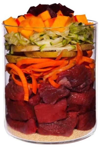 összetevők:  V adhús (47%), burgonya, sárgarépa, sütőtök (8%), cukkini, zeller, zsírszegény joghurt, cékla*, amarant (3%), repceolaj, osztriga*, sörélesztő*, áfonya* (0,6%), bazsalikom*, ásványi agyag*, virágpor*, tengeri moszat*, ásványi anyagok*szárítva Analitikai összetevők:  Fehérje 9,4 % zsír 5,2 % nyersrost 0,7 % nyershamu 1,1 % nedvesség 78,6 %, MJ/kg: 4 Tápanyag-adalékanyagok /kg:  Vit. A (3a672a): 4000 NE, Vit. D3 (3a671): 500 NE, Vit. E (3a700): 75 NE, Réz (3b405): 2 mg, Jód (3b201): 0,8 mg, Cink (3b603): 20 mg arány  Hús : zöldség/gyümölcs/növény : amaránt : egyéb nyersanyagok = 47% : 45% : 3% : 5% Táplálási útmutató: (normál súlyú felnőtt kutya)Kutya súlyaA javasolt adag (g)/nap2,5 - 5 kg140 - 3005 - 10 kg300 - 50010 - 20 kg550 - 110020 - 30 kg1100 - 165030 - 40 kg1650 - 2200