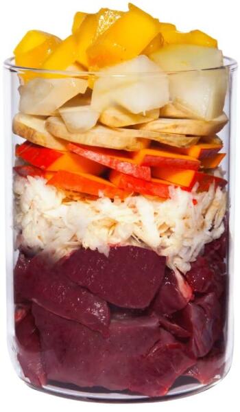 Kompozíció:  B orjúszív (43%), borjútüdő (13%), petrezselyem (10%), sütőtök, mézédes dinnye, paszternák, mangó (3,5%), kókuszliszt, fekete ribizli (0,7%), repceolaj, tökmagliszt, osztriga*, sörélesztő*, zsálya* (0,2%), andoki só, pitypang*, édesköménymag*, vízitorma*, ásványi agyag*, tengeri moszat*, ásványi anyagok. Analitikai összetevők: Fehérje 8,5 % zsír 4,8 % nyersrost 0,7 % nyershamu 1,4 % nedvesség 80,4 %, MJ/kg: 3,5 Tápanyag-adalékanyag ok/kg: Vit. A (3a672a): 4000 NE, Vit. D3 (3a671): 500 NE, Vit. 75 NE, réz (3b405): 2 mg, jód (3b201): 0,8 mg, cink (3b603): 20 mg Arány Hús : zöldség/gyümölcs/növény : egyéb nyersanyagok = 56% : 40% : 4% Táplálási útmutató: (normál súlyú felnőtt kutya)Kutya súlyaA javasolt adag (g)/nap2,5 - 5 kg160 - 3505 - 10 kg350 - 65010 - 20 kg650 - 130020 - 30 kg1300 - 190030 - 40 kg1900 - 2600