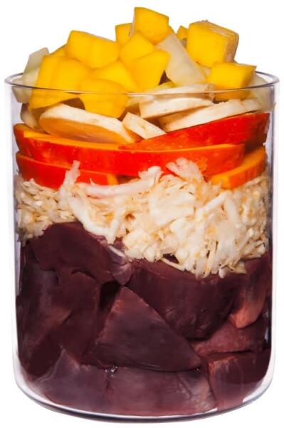 Kompozíció:  B orjúszív (43%), borjútüdő (13%), petrezselyem (10%), sütőtök, mézédes dinnye, paszternák, mangó (3,5%), kókuszliszt, fekete ribizli (0,7%), repceolaj, tökmagliszt, osztriga*, sörélesztő*, zsálya* (0,2%), andoki só, pitypang*, édesköménymag*, vízitorma*, ásványi agyag*, tengeri moszat*, ásványi anyagok. Analitikai összetevők:  Fehérje 8,5 % zsír 4,8 % nyersrost 0,7 % nyershamu 1,4 % nedvesség 80,4 %, MJ/kg: 3,5 Tápanyag-adalékanyag ok/kg:  Vit. A (3a672a): 4000 NE, Vit. D3 (3a671): 500 NE, Vit. 75 NE, réz (3b405): 2 mg, jód (3b201): 0,8 mg, cink (3b603): 20 mg Arány  Hús : zöldség/gyümölcs/növény : egyéb nyersanyagok = 56% : 40% : 4% Táplálási útmutató: (normál súlyú felnőtt kutya)Kutya súlyaA javasolt adag (g)/nap2,5 - 5 kg160 - 3505 - 10 kg350 - 65010 - 20 kg650 - 130020 - 30 kg1300 - 190030 - 40 kg1900 - 2600