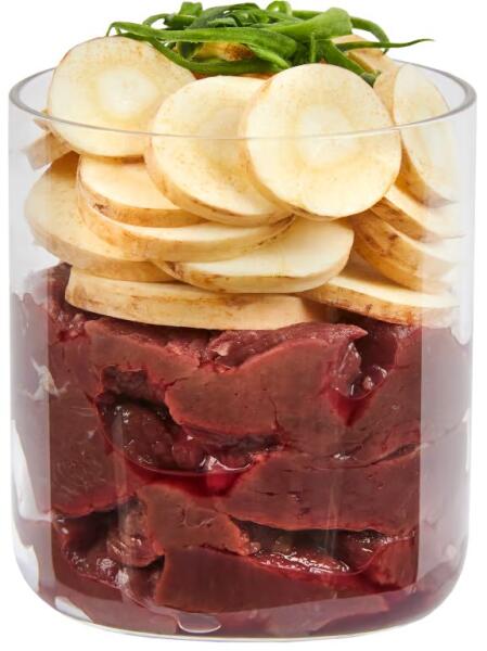 összetevők:  S trucc izom (60%), paszternák (36%), repceolaj, tengeri moszat*, ásványi anyagok. Analitikai összetevők:  Fehérje 12,5 % zsír 4,6 % nyersrost 0,4 % nyershamu 1,2 % nedvesség 77,5 %, MJ/kg: 4 Tápanyag-adalékanyagok /kg:  Vit. A (3a672a): 8300 NE, Vit. D3 (3a671): 370 NE, Réz (3b405): 2 mg, Mangán (3b503): 9,8 mg, Jód (3b201): 0,6 mg, Cink (3b603): 20 mg. Arány  Hús : zöldség : egyéb nyersanyagok = 60% : 36% : 4% Táplálási útmutató: (normál súlyú felnőtt kutya)Kutya súlyaA javasolt adag (g)/nap2,5 - 5 kg160 - 3505 - 10 kg360 - 65010 - 20 kg650 - 130020 - 30 kg1300 - 190030 - 40 kg1900 - 2600