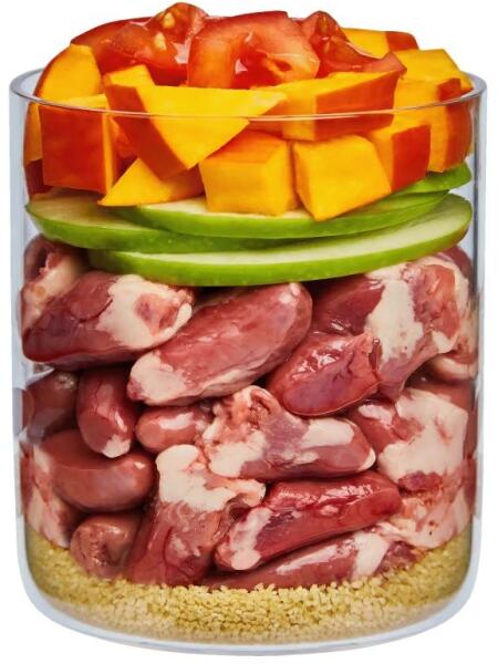 Kompozíció:  C sirkeszív (33%), csirkehús (14%), sütőtök (14%), köles, alma, paradicsom, csirkeizom (6%), csirkemáj (4%), repceolaj, tökmagliszt (1%), osztriga*, sörélesztő*, kamilla* (0,2%), diatómaföld*, csipkebogyópor*, ásványi agyag*, tengeri moszat*, ásványi anyagok. Analitikai összetevők:  Fehérje 8,7 % zsír 4,4 % nyersrost 0,3 % nyershamu 2 % nedvesség 78,3 %, MJ/kg: 3,8 Tápanyag-adalékanyag ok/kg:  Vit. A (3a672a): 800 NE, vit. 340 NE, réz (3b405): 2 mg, jód (3b202): 0,8 mg, cink (3b603): 20 mg, mangán (3b502): 0,8 mg, vas (3b103): 30 mg. arány  Hús : köles : zöldségek/gyümölcsök/növények : egyéb alapanyagok = 57% : 7% : 33% : 3% Táplálási útmutató: Ezek az értékek hozzávetőlegesek. Állatorvosi növekedési táblázat használata ajánlott. Egy felnőtt kutya becsült súlya 1,5 - 3 hónapos korig 4 - 5 hónapos 6 - 9 hónapos 9 - 12 hónapos < 5 kg130 - 520g210 - 570g200 - 510g170 - 470g5 - 10 kg330 - 740g550 - 870g570 - 760g510 - 740g10 - 20 kg430 - 1120g820 - 1470g870 - 1350g760 - 1170g20 - 30 kg600 - 1260g1340 - 1670g1500 - 1860g1350 - 1560gTáplálási ajánlás vemhes vagy szoptató szukáknak/nap:5 kg200 - 400 g10 kg400 - 800 g20 kg800 - 1200 g30 kg1200 - 1800 g
