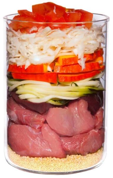 Kompozíció:  n yúlhús (30%), pulykamáj (26%), sütőtök, cukkini (7%), paradicsom, köles, zeller, amarant (4%), repceolaj, osztriga*, sörélesztő*, vízitorma* (0,2%), bazsalikom, őrölt lenmag, ásványi agyag*, andoki só, virágpor*, tengeri moszat*, ásványi anyagok *szárítva. Analitikai összetevők:  Fehérje 9,7 % zsír 3,9 % nyersrost 0,8 % nyershamu 1,4 % nedvesség 77,4 %, MJ/kg: 3,8 Tápanyag-adalékanyag ok/kg:  Vit. D3 (3a671): 350 NE, Vit. E (3a700): 75 NE, Réz (3b405): 1 mg, Jód (3b201): 0,8 mg, Cink (3b603): 20 mg. arány  Hús : zöldségek/gyümölcsök/gyógynövény ek : amarant + köles : egyéb alapanyagok = 56% : 32% : 4 + 6% : 2% Táplálási útmutató: (normál súlyú felnőtt kutya)Kutya súlyaA javasolt adag (g)/nap2,5 - 5 kg140 - 3005 - 10 kg300 - 50010 - 20 kg550 - 110020 - 30 kg1100 - 165030 - 40 kg1650 - 2200