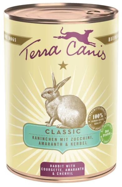 A Terra Canis Classic egy teljes értékű eledel nyúlhússal, cukkinivel, amaránttal és vízitormafélékkel minden fajta felnőtt kutyának. A CLASSIC termékcsaládba tartozó Terra Canis konzervtáp magas arányban tartalmaz húst és friss zöldségeket, gyümölcsöket és fűszernövényeket. Tápanyagokban gazdag, könnyű, gluténmentes álgabonákat (pl. köles, amarant, természetes rizs) adunk hozzá nagyon kis mennyiségben, amelyek a kutya számára könnyen emészthetőek (4-10%). A természetes összetevők (tengeri moszat, ásványi agyag, virágpor, csipkebogyó, andoki só, sörélesztő) fontos vitaminokat, ásványi anyagokat és nyomelemeket biztosítanak. A repceolaj értékes esszenciális zsírsavakat biztosít. Minden összetevő 100%-ban emberi fogyasztásra alkalmas minőségű. Minden összetevő 100%-ban emberi minőségűHentesmesterek által készítettOsztrigahéjból származó kalciummalGluténmentesÁllatorvosokkal közösen kifejlesztveNem tartalmaz felesleges adalékanyagokat